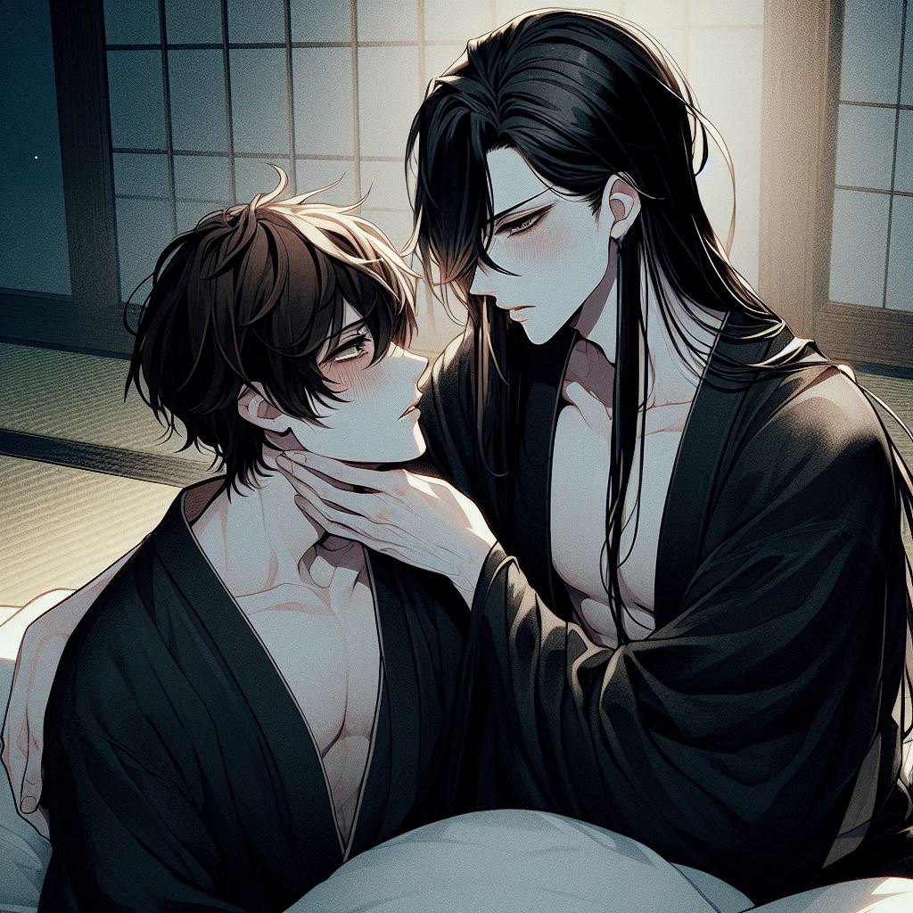 就在那一瞬間,陽冷不防撲向雅,讓雅失去平衡,往後倒向榻榻米上的被褥。陽就這樣壓在他的身上,用力按住雅的肩膀,限制對方的行動。
